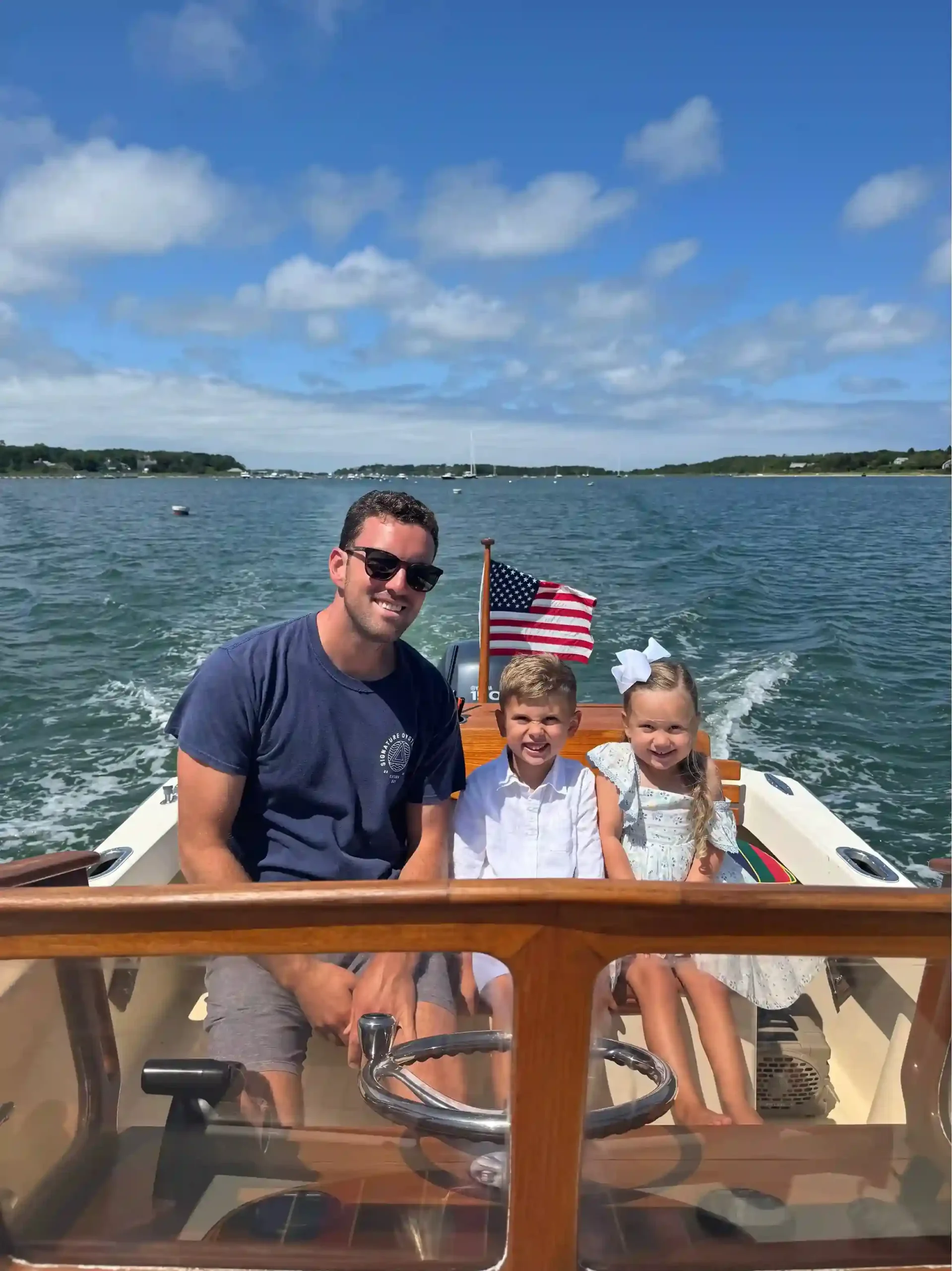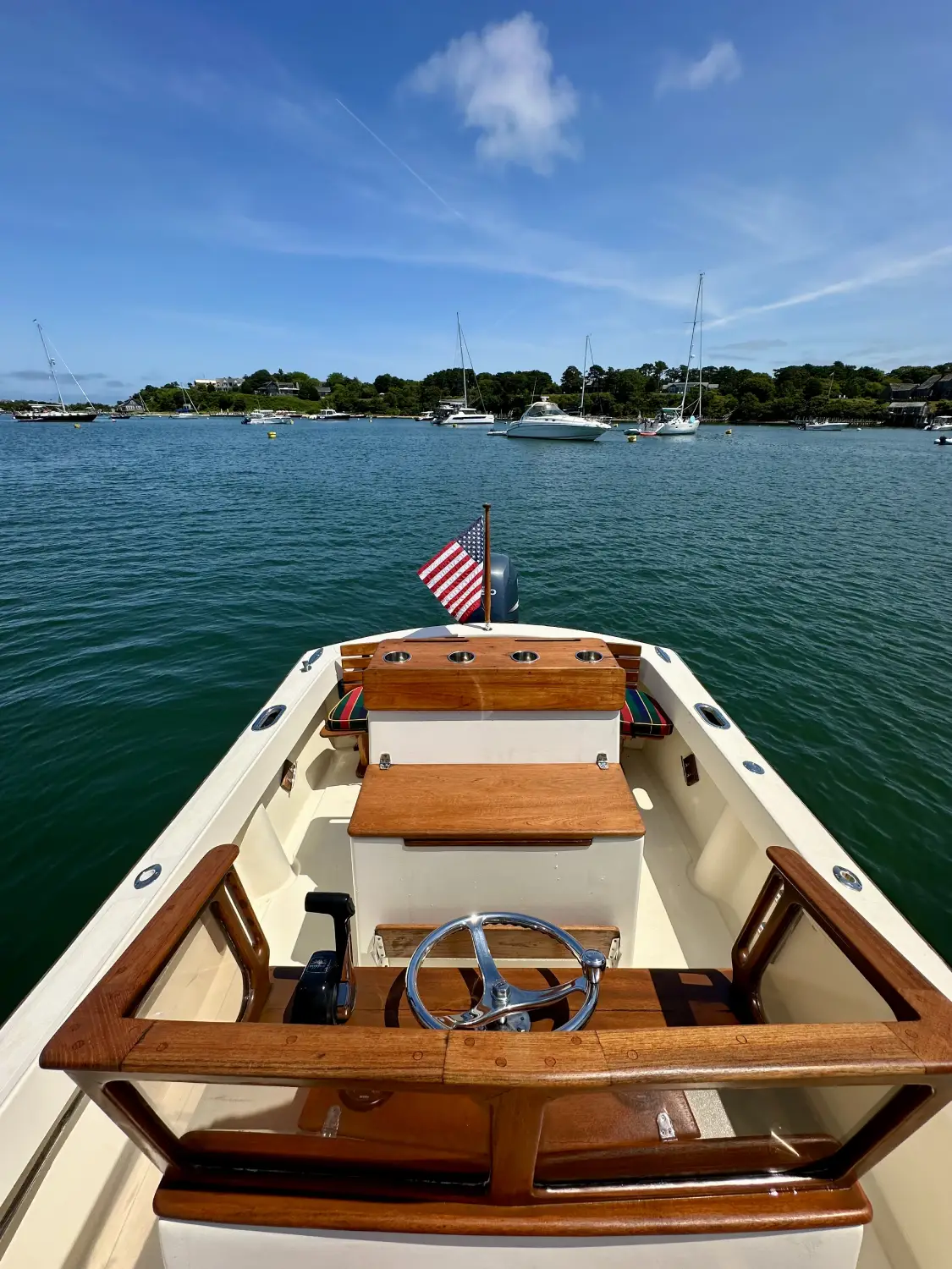 Crafted in New England for local waters, our Roth Bilt center console features a blue hull, elegant wood accents, and Ralph Lauren–inspired cushions. She seamlessly combines comfort, timeless beauty, and exceptional maneuverability.